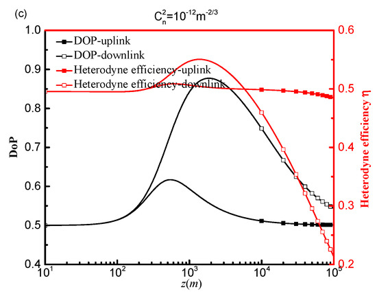 Heterodyne efficiency and DoP are shown in Figure 7a–c as a function of transmission distance z for various refractive index structure parameters. As shown in Figure 7a–c, the heterodyne efficiency and DoP of an uplink path and a downlink path are extremely similar within a transmission distance of 100 m. This is because, when the transmission distance is relatively small, the random fluctuation carried upon by the refractive index may be omitted. The maximum DoP and heterodyne efficiency of a downlink propagation path correspond to a transmission distance that is greater than an uplink propagation path, and it decreases with an increasing atmospheric refractive index structure constant 10−16 m−2/3 to 10−12 m−2/3. As the transmission distance increases, the DoP and heterodyne efficiency of a downlink path are significantly impacted by strong atmospheric turbulence, as compared to weak and medium-strong atmospheric turbulence intensities. This is due to the fact that when the number of small-scale gyres increases in the area of considerable atmospheric turbulence, the diffraction of the signal beam is strengthened, which is consistent with the findings in Figure 6.