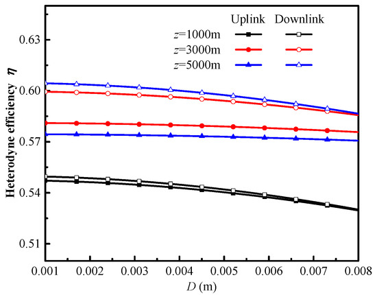 For various transmission distances, Figure 8 illustrates the heterodyne efficiency as a function of detector aperture D. As shown in Figure 8, the heterodyne efficiency of a downlink path and an uplink path decreases with increasing detector size. The heterodyne efficiency of a downlink path is also higher than that of an uplink path. Additionally, the heterodyne efficiency increases with an increasing transmission distance on a downlink path and an uplink path. This is due to the fact that the zenith angle decreases as the transmission distance increases, the corresponding atmospheric turbulence intensities decrease, spatial coherence deteriorates and the impact of atmospheric turbulence on the beam is reduced.