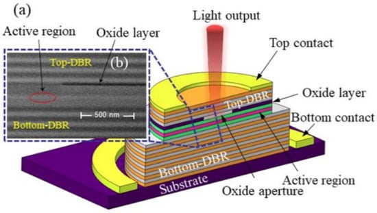 The image of high speed 850 nm VCSEL. (a) Schematic diagram and (b) FIB-SEM image in cross section of the active region.