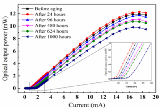 The characteristic variations of the optical output power with bias current during the accelerated aging are presented in Figure 2. The electrical aging stress was set at 20 mA. The power saturation currents were basically unchanged, and the error for all measured values was less than 0.01 mW. It was observed that the threshold current and the output optical power present clearly changed. Threshold current and external quantum efficiency, versus aging time curves, were plotted in Figure 3. In the early stage of aging, the threshold current decreased from 1.04 mA to 0.87 mA, and the output optical power increased by 2.8%. This phenomenon was caused by the annealing effect. The annealing effect refers to the photoelectric performance of the device which is recovered when positive bias is carried out. It can be explained by the compound enhanced defect [20]. The rate of defect recombination is linearly correlated with the density of the charge injection. As the number of defects decreases, the threshold current is gradually recovered. At the same time as the nonradiative recombination decreases, the junction temperature of the device decreases, the number of photons produced by carrier recombination increase, and the output optical power increases. Whereas, after 96 h aging, the threshold current increased, as shown in the inset of Figure 2, the output optical power and the external quantum efficiency decreased. This indicated that the degradation of the VCSELs was gradually activated.