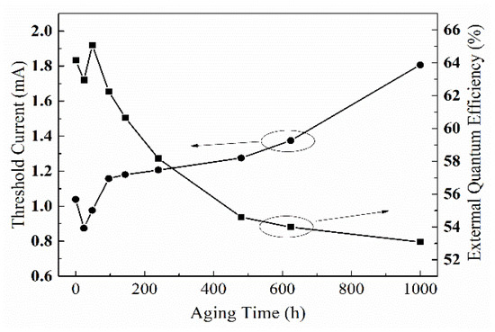 where ηe is the EQE, ηd is the slope efficiency, λ is the operating wavelength, h is Planck’s constant, c is speed of light. EQE can more intuitively reflect the degradation of the quantum well region with aging conditions. The calculation results of EQE with aging time are shown in Figure 3. EQE gradually decreased with the increase of aging time. After 1000 h aging, EQE had degenerated to 82.76% compared with that before aging. As defects proliferated after aging, the nonradiative recombination center increased and recombined some carriers, and the number of photons generated per second decreased when the number of electron hole pairs injected into the active region were constant per unit time. Therefore, EQE decreased with increased aging time.