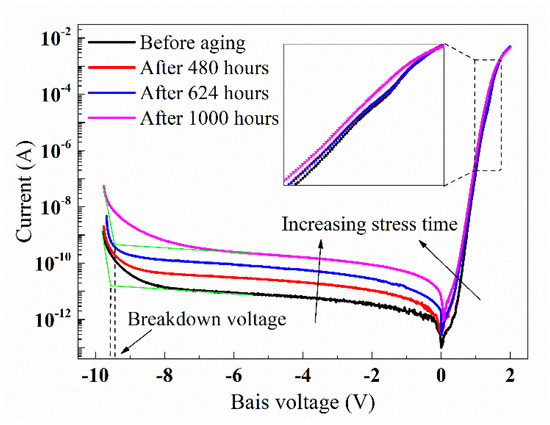 The forward and reverse current–voltage characteristics of devices before and after aging is shown in Figure 4. The electrical aging stress was set at 20 mA. When the forward bias voltage was lower than 1.5 V, the forward current increased obviously with aging time. The carrier injection into the active region was mainly by means of the tunneling mechanism [14,22], which was mainly through the defect located in the space charge region, and was dominated by nonradiative recombination. When the forward voltage was in the 1.5 V to 2 V range, as shown in the inset of Figure 4, the forward current increased slightly with the aging time. The injected carriers diffused through the whole active region, which was dominated by radiation recombination. When the forward bias voltage was larger than 2 V, the forward current did not obviously change with aging time. In this case, the influence of series resistances (from bulk resistances and contact resistances) could not be ignored, and the compound current dominated at this time.
