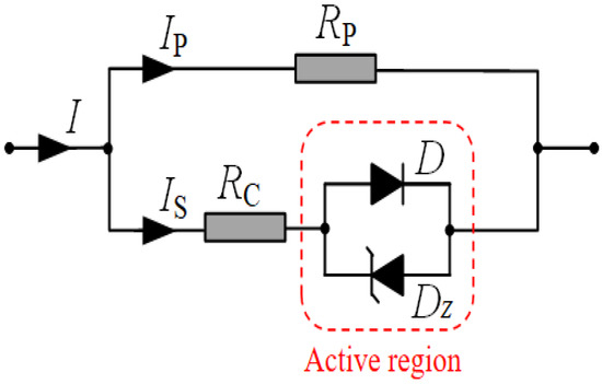 The 1/f noise is dominant in the low-frequency noise produced by the PN junction semiconductor laser, and, thus, investigation of 1/f noise characteristics is more valuable for the semiconductor laser than other low-frequency noise. To analyze the origin of the 1/f noise, a simplified equivalent circuit was used, shown in Figure 5 (the case of the parallel leakage of laser diode was considered). When bias current was lower than the threshold current, the electrical characteristic of the laser diodes could be approximately modeled as that of typical diodes, mainly composed of the PN junction dynamic resistance Rd, the contact resistance Rc and the leakage resistance Rp [23].