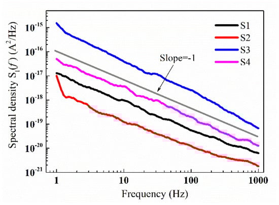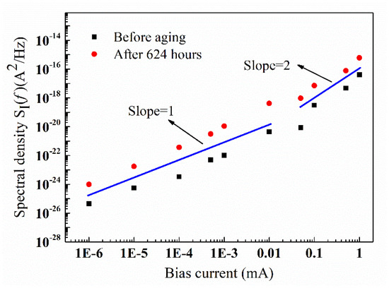 The current noise power spectral density curves of the typical samples with bias current 0.1 mA are shown in Figure 6. Compared with the reference curve (the slope was −1), the current noise power spectral density curves were nearly parallel, which indicated that the noise component in this frequency band was mainly composed of the 1/f noise. The 1/f noise characteristics were tested for 12 preaging samples. All the results showed the 1/f noise features, but there were differences in the noise intensities.
