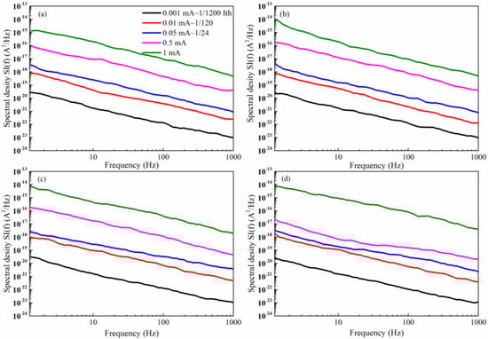 In order to analyze the dependence of low-frequency noise on electrical aging stress, the typical results were selected for demonstration. The current noise power spectral density versus frequency at different bias currents are shown in Figure 7a–d. The electrical aging stresses were set as 12 mA, 15 mA, 17 mA and 20 mA, respectively. The results of the 1/f noise characteristics of the samples were measured after 1000 h aging. In the operating conditions for the low bias current (below the threshold current) and low frequency band (1 Hz~1 kHz), the current power spectral density of the 1/f noise samples was analyzed. The different samples presented similar regularity in the same aging condition and bias current, and the distinctions were mainly reflected in the noise intensities. The experimental results showed that the current noise power spectral density of all the tested samples decreased with frequency increasing, and current noise power spectral density increased with the bias current in the low frequency band. Compared with the power spectral density of the 1/f noise samples before aging, all the spectral densities of the 1/f noise of devices in this frequency range increased.