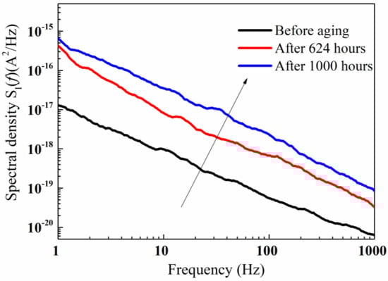 In order to analyze the dependence of low-frequency noise on aging time, a typical result was selected for demonstration. The measured low-frequency noise behaviors of the samples in the aging process are shown in graphs in Figure 8 and Figure 9. From Figure 8, we can see that the noise power spectral density after 1000 h aging was nearly two orders of magnitude higher than that before aging when the bias current was 0.1 mA. In addition, it can also be seen from Figure 9 that the noise level of the sample after aging was larger than the sample before aging, which indicated that there were more internal defects created in the active region during the aging process. The case was closely related to the reliability of VCSELs.