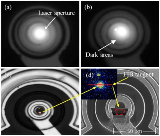 When the forward bias voltages of the samples before and after aging were 1.3 V and 1.39 V, the electroluminescence images are shown in Figure 10a,b. The emission intensity of the sample after aging was obviously lower than that before aging, and the distribution of the emission intensity of the sample was obviously uneven, and the emission dark area appeared. The total optical power and emission efficiency decreased, which was consistent with the attenuation of the optical output power of the sample after aging. When a reverse bias voltage of 9.16 V was carried out to the sample after aging, the EMMI image located the defect of the sample, as shown in Figure 10c. There were two abnormal light spots (red area) on the edge of the light output aperture. It could be judged that the defects proliferation was located in the red areas, as there was the path of current in the areas, leading to the increase of forward current and reverse leakage current. In order to reveal the microstructure changes in the dark area of the sample after aging, a dual-beam system focused ion beam was used to cut and mill the dark area, as shown in Figure 10d. The colorized close-up of the insert of Figure 10d corresponded to the red dots region in Figure 10c, and the solid line showed the position of FIB in Figure 10d.