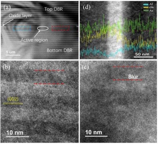 The TEM image of the FIB cross section is shown in Figure 11a. The TEM image revealed that some areas in the quantum well hetero-junction of the active region of the sample after aging were blurred. The defects seemingly originated from the active layers under the oxide layer. Figure 11b,c show a magnified image of the region of interest (the bule box and the red box) in Figure 11a. Figure 11b shows that the hetero-junction interface was flat, without obvious structural fluctuation. Grain boundaries were clear and no obvious defects were observed. Figure 11c shows that the hetero-junction interface appeared blurred, and a large number of high-density dislocation defects were generated, which spread to the surrounding areas. Usually, the electrically accelerated aging, or ESD damage, dislocation defects generate in the active region of VCSEL [26,27], which leads to the contagion of dislocation defects, and these dislocation defects sprawl to the surrounding area under electrical stress. Further, an EDS-line scan was used to analysis the element distribution of the sample, as shown in Figure 11d. The distribution curves of Ga and Al elements fluctuated near the hetero-junction interface, and the diffusion phenomenon of Ga and Al elements appeared, which became point defects. When the point defects accumulate to a certain extent to form dislocations, they eventually lead to failure.