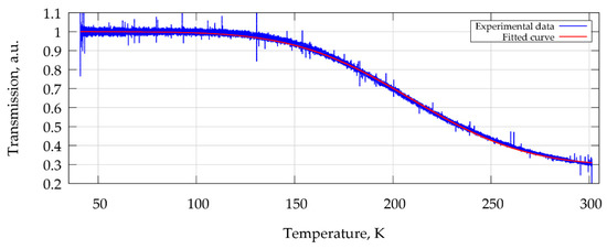 The active element was gradually cooled from room temperature to a temperature of 40 K. The temperature of the active element was measured by a thermocouple placed inside the copper cube just behind the active mirror. Based on the cooler passport data and the known parameters of the cooling system, the cooling rate of the system was estimated to be 0.14 K/s. The main contribution to the heat capacity of the system is made by the massive copper cube and cryogenic cooler own heat capacity. Using a thermocouple, the cooling rate of the active element was measured; it is 0.12 K/s, which is close to the calculated value. The transmittance is determined by the power ratio , where P1 and P2 are the radiation power recorded by power meters 1 and 2, respectively. The dependence of the transmittance of the system on the temperature of the active element is shown in Figure 2.
