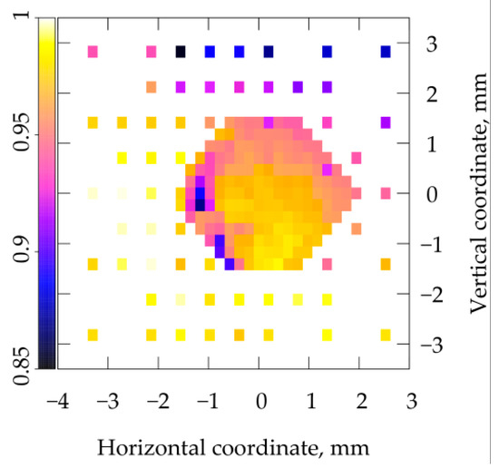 It has been experimentally established that the shape of the transmittance curve on temperature does not depend on the position of the beam in the crystal, and the differences between the fitted curves do not exceed 1%. A map of the transmittance at 40 K versus the coordinates of the scanning beam in the crystal is shown in Figure 3. The measurements were averaged over 30 s with a sampling frequency of 10 kHz for each point of the map. The standard deviation of the transmittance values in any point does not exceed 1%. The region of the active element around the expected center of the pump radiation spot was measured with a smaller step. The decrease in transmittance along x~−1 mm is associated with defects in the optical system.
