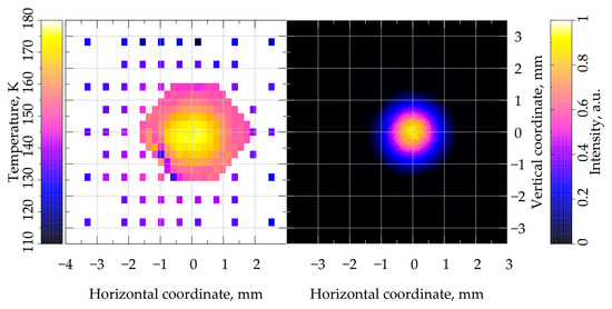 Next, the dependence of the transmittance on time with pumping was studied. The dependence of the average temperature on the position of the scanning laser beam in the pumped mode is shown in Figure 4 (left). The pump pulse duration was as short as 0.6 ms, the repetition rate was 1000 Hz, and the beam diameter was 2 mm at the 1/e2 level with a supergaussian profile (Figure 4, right).