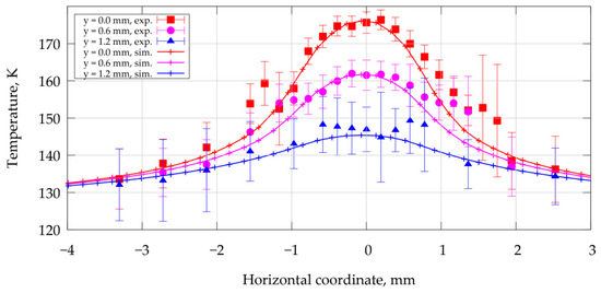 The dependencies for horizontal sections are shown in Figure 6. The scanning laser radiation enters the active element at an angle of 6° in horizontal plane (Figure 1) with respect to the normal to the surface, and is perpendicular to the surface in vertical plane. Thus, the scanning beam walk-off after passing through the active element is 0.64 mm. The beam walk-off and its final size lead to a smoothing of the curve of the dependence of the equivalent temperature on the scanning laser spot position.