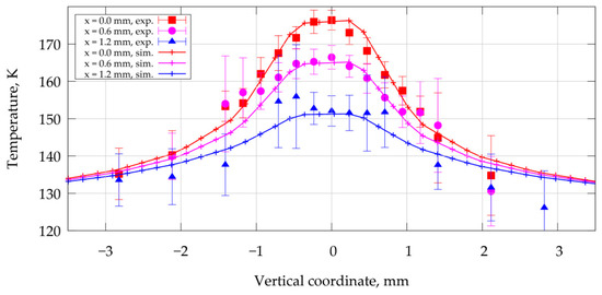 Cross-sections of the vertical distribution of the equivalent temperature. “exp.” denotes experimental data, and “sim.”—simulated data. The average absorbed pump power is estimated to 105 ± 3 W.