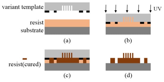 The steps of the NIPL process are very simple, as shown in Figure 2. The variant template is first pressed into the resist film while being UV-exposed (Figure 2a,b). The part of the resist under UV exposure is cured, and the other part under the metal light-blocking layer remains. After the variant template and substrate are separated, the substrate is immersed in the developing solution to remove the unexposed resist. Both nanoscale and larger-scale patterns can be produced in the resist film in one single step. The NIPL process requires no additional equipment and can be performed with existing NIL machines; it can produce complex, cross-scale structures including nanoscale patterns in a single step without the need for multiple alignments and lithography processes, and the production accuracy is comparable to that of conventional NIL.