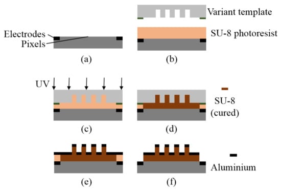 With respect to the integration of the nanowire polarizer and the image chip, it involves a micro–nano cross-scale process for the nanowires and other patterns such as the electrodes of the image chip. Among the fabrication techniques of micro- and nanoscale-integrated structures, the multistep shaping method [,,] combines the commonly used microprocesses such as MEMS with nanofabrication technology to perform multiple pattern transfers on the same substrate, and finally, the micro- and nanoscale-integrated structures are obtained. It is flexible and can realize multiscale-integrated structures with complex patterns. However, the multistep shaping method usually requires multiple “lithography–etching” processes to process patterns for different sizes, in which the steps need to be precisely aligned with each other, and the accuracy of pattern transfer is easily reduced, resulting in a complex, time-consuming, and costly process. As commonly used nanofabrication techniques, electron-beam lithography (EBL) and focused ion beam (FIB) have high resolution but costly equipment and low efficiency and, therefore, are especially not suitable for micronlevel or larger patterns [,]. Nanoimprint lithography (NIL) is highly adaptable in both research and industry because of its high throughput and low cost, which can prepare micro- and nanostructures on large areas with high efficiency [,,,]. NIL replicates nanostructures on a template onto a polymer film by driving polymer flow through mechanical extrusion. With a core of polymer flow, NIL thus has some potential deficiency; for example, the amount of polymer flow required is different for different sizes of feature structures at different locations, and larger structure features on the template will require more polymer flow transferred at a far distance. Filling efficiency is different, and pattern replication may result in pattern defects or incomplete pattern filling. This problem is more obvious when producing cross-scale structures with non-uniform distributions. Such limitations of NIL are inherent and are related to the fabricated patterns, which cannot be solved by methods such as optimizing the process parameters of nanoimprinting technology. To enable the fabrication of micro–nano cross-scale structures, especially when it comes to the fabrication of large-area structures, NIL needs to break through its limitations. In addition, the lithography process is the most central bottleneck process in the micro- and nanomanufacturing industries such as integrated circuit manufacturing. In addition to the further development of new lithography techniques suitable for smaller patterns, improving the accuracy and flexibility of the existing lithography process is also of extraordinary significance for micro- and nanodevice fabrication. Some methods based on nanoimprinting and standard photolithography are reported. Cheng et al. proposed the combined nanoimprint and photolithography (CNP) using the hybrid mask–mold (HMM) and with the CNP method, resist patterns with a higher aspect ratio and with no residual layer can be obtained in a single step []. The utilized HMM was made from fused silica by appropriate lithography and RIE process. Christiansen et al. demonstrated the fabrication of polymer optics with nm to mm features by CNP [,]. The CNP stamp was fabricated through EBL on a quartz wafer. Lohse et al. demonstrated a scalable method via CNP for the preparation of microfluidic channels with nanopatterns. The excellent compatibilities of the polymer master to the UV-PDMS stamp and further between the UV-PDMS stamp and the imprint resist mr-NIL are the key factors for replication on large scale with high accuracy [].