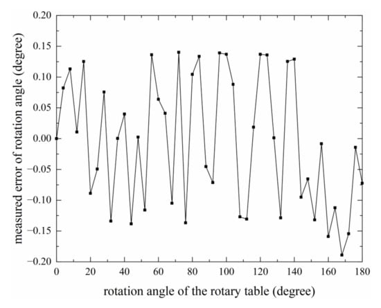 The rotary table stopped every 4° of rotation for a total of 180°. The rotary table remained for 1 min at every stop, and at the same time, the polarization angles of the integrated polarization sensor were calculated. The rotation angle of the rotary table from the starting point was regarded as the theoretical rotation angle. The change in the angle of the sensor between the currently measured angle and the measured angle at the starting point was regarded as the measured rotation angle. The difference between the measured rotation angle and the theoretical rotation angle at every stop was the measured angle error of the polarization sensor. As shown in Figure 7, the error of the measured polarization angle was ±0.2°. The causes of this measurement error are possibly the presence of pixel noise, circuit noise, and the non-uniformity of the nanogratings. Through the performance test, it was shown that the integrated polarization sensor has the capability to detect the polarization angle of incident light. In a further study, we plan to investigate the potential of the integrated polarization sensor for application in autonomous navigation in combination with the distribution of a polarized skylight pattern.