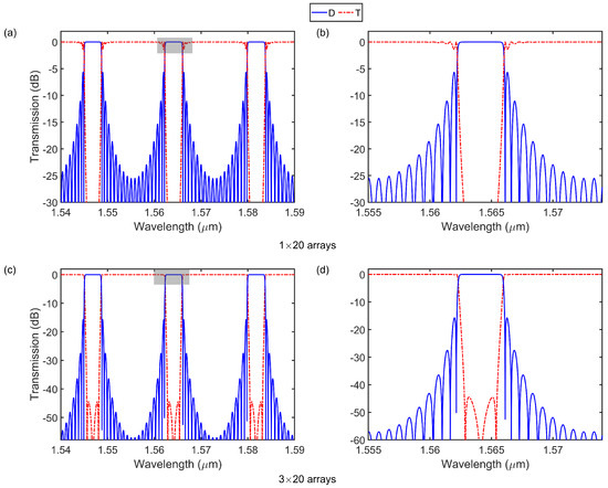 Transmission spectrum at the through (red dashed line) and drop ports (blue solid line) for the (a,b) arrays and the (c,d) arrays. (b,d) are the enlarged figures of the shadow area in (a,c).