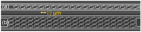 The device was fabricated on a commercial SOI wafer with 340-nm-thick top silicon and 2 m thick buried silicon dioxide. The device was patterned using a slab height of 130 nm and the ridge waveguide height of 210 nm. Electron-beam lithography was used to transfer the pattern to the wafer. Then, we used an inductively coupled plasma etching system to dry etch 210 nm of the top silicon layer. In Figure 5, the optical microscope images for the etched structures are illustrated for the 1D and 2D array. The widths of the bus waveguides and ring waveguides were 450 nm (to retain the single mode) and 600 nm (for a lower bend loss and single mode control), respectively. The original major axis of the elliptical microring was set to be 6 m (minor axis is 4.112 m). Compared with circular rings and racetrack resonators, the elliptical microring can enhance the coupling rate and reduce the mode mismatch due to its slowly bent coupling region between the waveguide and elliptical ring [19]. To achieve a cross power coupling rate of , the gap between the waveguide-to-ring was set to be 140 nm, and the gap between the rings was 80 nm to obtain .