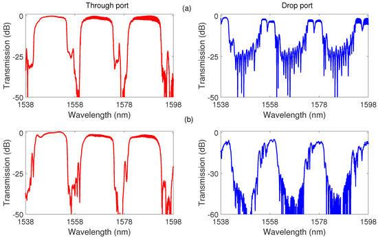 - Liu, D.; Zhang, C.; Liang, D.; Dai, D. Submicron-resonator-based add-drop optical filter with an ultra-large free spectral range. Opt. Express 2019, 27, 416–422. [Google Scholar] [CrossRef]