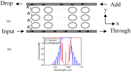 - Little, B.E.; Chu, S.T.; Hryniewicz, J.V.; Absil, P.P. Filter synthesis for periodically coupled microring resonators. Opt. Lett. 2000, 25, 344–346. [Google Scholar] [CrossRef]