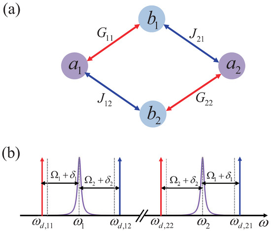where , , , and are the field-enhanced optomechanical coupling strengths. Here, we denote as the red (blue) sidebands of cavity on the mechanical mode . Due to the loop interaction in this optomechanical system, only the phase difference between the optomechanical coupling strengths has physical effects. By redefining the operators , the Hamiltonian Equation (2) becomes