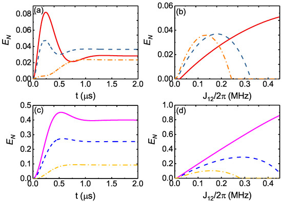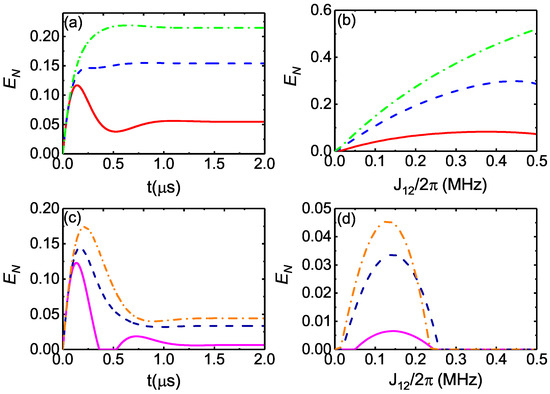 We proceed to study the effect of the entangling-interaction strength on the entanglement in Figure 3, assuming for simplicity. Figure 3a and Figure 3c plot, respectively, the dynamics of the cavity–cavity entanglement and mechanical–mechanical entanglement for , and . It is shown that stationary entanglement can be achieved after μs, which depends on the phase difference . Moreover, Figure 3b and Figure 3d plot the stationary cavity–cavity entanglement and mechanical–mechanical entanglement as functions of the entangling-interaction strength for different values of phase difference . At , both the cavity–cavity entanglement and the mechanical–mechanical entanglement are enhanced monotonically with the increase in the coupling strength in the parameter regimes. When the phase difference is tuned to be or , the stationary logarithmic negativity becomes larger and reaches the maximum with the increase of . With further increasing , the entanglement will decrease and be zero above a critical value of . On one hand, it is straightforward that the entanglement can be enhanced by increasing the coupling strengths , which are strengthened by the blue-detuned driving fields. On the other hand, increasing can suppress the cavity-cooling effect for given and increase the effective temperature of the cavity and mechanical modes, which will reduce the entanglement. In addition, when the coupling strengths and are too strong, the system will become unstable. Therefore, the maximum entanglement is achieved by balancing these two competing effects [35]. Throughout this work, we have checked numerically that the chosen parameters satisfy the stability condition.