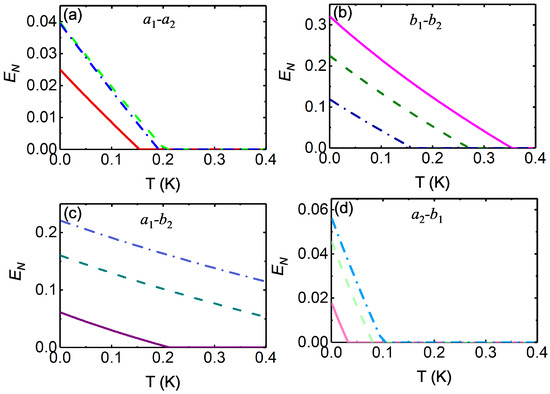 Plots of logarithmic negativity as functions of the environment temperature T for (solid lines), (dashed lines), and (dash-dotted lines). Panel (a) represents the entanglement between the two cavity modes, panel (b) represents the entanglement between the two mechanical modes, panel (c) corresponds to the entanglement between the cavity mode and mechanical mode , and panel (d) corresponds to the entanglement between the cavity mode and mechanical mode . The other parameters are the same as those in Figure 3, except MHz.