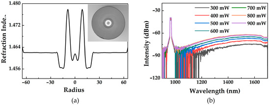 PbSe-doped RCF was prepared using MCVD technology by the following process [32]: Firstly, a quartz-based tube was heated to over 1700 °C with a hydrogen–oxygen flame to introduce SiCl4, GeCl4, and borides. Secondly, a boride-doped inner-cladding layer was deposited. Thirdly, PbSe powder was deposited on the inner surface of the inner cladding via high-temperature evaporation. Subsequently, boride was introduced again to form a solid core. Finally, the preform was drawn into a PbSe-doped RCF with a specified geometric diameter. A cross-sectional image of the actual fiber and its refractive index distribution is presented in Figure 3a. The ring-core thickness was 8 μm, and the refractive index difference between the ring core and the inner cladding was 2.2%. Additionally, the fiber loss at 1550 nm was measured to be 0.25 dB/m using the truncation approach. The fluorescence spectrum of an optical fiber reveals its luminescent qualities. The fluorescence characteristics of the PbSe-doped RCF were measured using reverse pumping with a 980 nm laser, as shown in Figure 3b. The fluorescence ranged from 1150 nm to 1700 nm thanks to the different size distributions of PbSe QDs. The intensity of the fluorescence increased with increasing pumping power. At 800 mW, the fluorescence intensity ceased to increase and approached saturation, this is due to the complete inversion of particles in the PbSe QDs two-level system.
