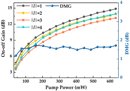 To evaluate the mode gain, an optical power meter was used to measure the total power before and after OAM mode amplification. The variation of on–off gain and DMG with pump power was investigated, as shown in Figure 7. The pump power varied from 42 mW to 634 mW and the experimental signal power and wavelength were −45 dBm and 1550 nm, respectively. The maximum on–off gains for the OAM|l|=1, OAM|l|=2, OAM|l|=3, and OAM|l|=4 modes were 14.9 dB, 13.9 dB, 13.2 dB, and 14 dB, respectively, while DMG was less than 1.7 dB. Evidently, the on–off gain increases with increasing pump power and tends to saturate. It primarily results from the fact that the particle number reversal in the PbSe QD energy level system gradually reaches saturation. The DMG values are generally small, which may be attributed to the pumping mode and the distribution of the PbSe QDs. The noise in fiber amplifiers is mostly caused by amplified spontaneous emission (ASE). Because the PbSe-doped RCF has a lower PbSe QD doping concentration, the ASE of the amplifier has less impact on the signal light.