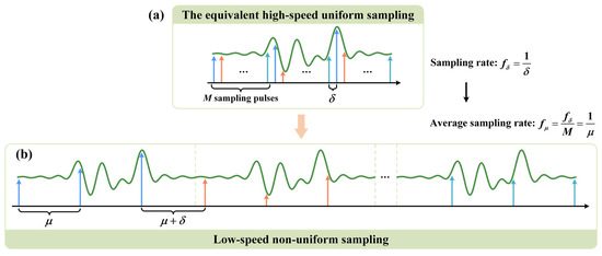 18], the non-uniform sampling optical pulses were formed by randomly selecting one pulse from the middle four pulses of every ten uniform optical pulses. Nevertheless, this sampling strategy is unable to acquire the signal information identical to that obtained through its equivalent high-speed uniform sampling, since some of the optical pulses are blocked throughout the sampling. Hence, it cannot be used to digitize a broadband signal, e.g., a linear frequency modulation (LFM) signal. In [