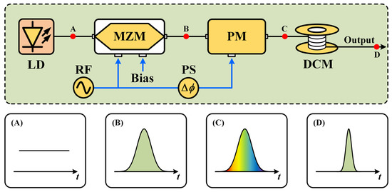 Figure 4 shows the architecture of the optical source. Continuous-wave (CW) light from a laser diode (LD) is first injected into an electro-optic MZM biased at its quadrature point and driven by a single-tone microwave signal with a peak-to-peak voltage equal to its half-wave voltage. Hence, an optical pulse train with a repetition frequency equal to the microwave signal is generated. Then, the optical pulse train is injected into an electro-optic phase modulator (PM) also driven by the single-tone microwave signal. Thereinto, the phase of the microwave signal is finely adjusted by using a phase shifter (PS) to guarantee that the peak or the valley of the microwave signal aligns with each optical pulse in the PM. In addition, the microwave signal applied to the PM is with a high power. On this condition, a large linear chirp is introduced into each optical pulse. Finally, the linear chirp of the optical pulse is compensated by using a dispersion compensation module (DCM). As a result, an ultra-short optical pulse train with a picosecond-level pulse width is generated, where the repetition frequency is equal to the single-tone microwave signal applied to the modulator.