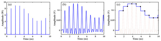 Figure 6a shows the waveform of the sampled optical pulse train. Then, a PD with a 3-dB bandwidth of 1 GHz is used to achieve photoelectric conversion of the sampled optical pulse train, where the unit impulse response time of the PD is shorter than the minimum sampling interval of 1 ns.