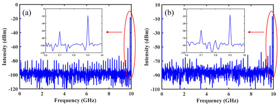 Figure 8a shows the reconstructed spectrum of the input signal. It can be seen that the recovered signal is a single-tone microwave signal at 9.9 GHz, which is identical to the input signal. The relatively large spur at 9.7 GHz is attributed to the 3rd-order modulation nonlinearity of the MZM, i.e., 9.9 × 3 − 20 = 9.7 GHz. For comparison, the equivalent high-speed uniform photonic sampling with a sampling rate of 20 GSa/s is used to digitize the same input single-tone microwave signal. In order to facilitate comparison, the sampled optical pulse train is digitized by using a single electronic ADC with a sampling rate of 20 GSa/s, an operation bandwidth of 10 GHz and an ENOB of 7 bits.
