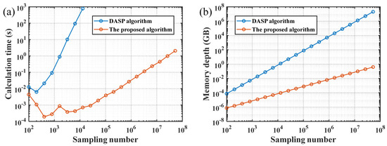 4, the calculation time of the proposed algorithm is millions of times lower than that of the DASP algorithm, which is benefited from the FFT calculation of a one-dimensional data array in the proposed algorithm instead of the two-dimensional data array calculation in the DASP algorithm. In addition, when the sampling number exceeds 10