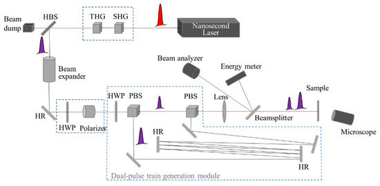 The damage testing setup with UV temporally shaped, double-nanosecond-pulse train is shown in Figure 1; it comprises a laser source, frequency conversion, beam expander, energy adjustment, dual-pulse train generation, laser diagnostics and sample stages. The nanosecond laser source delivers pulses at 1064 nm with a beam diameter of 7 mm and a repetition rate of 10 Hz. Two pieces of BBO crystals are used as the frequency conversion module to obtain a 355 nm laser pulse with a FWHM width of 7 ns. The beam expander module, which consists of concave and convex lenses, is used to reduce the divergence of the laser beams to ensure the same size of the focal spot of the two sub-pulses with paths of different lengths. The combination of the half wave-plate (HWP) and polarizer is used to adjust the total energy of the dual-pulse. The dual-pulse train generation module consists of pulse splitting, delay line and combination. HWP and a polarization beam splitter (PBS) are used to generate two sub-pulses with different polarizations and to control their energy ratio by rotating the HWP. In the delay line, the path of a long delay, i.e., up to tens of nanoseconds, is generated with multiple reflections between small-angle mirrors. The second PBS combines the two sub-pulses with different delays to obtain the dual-pulse train with the orthogonal polarizations. The dual-pulse train is focused on the sample exit surface with a small incident angle. The focal spot and pulse energy are monitored by the beam analyzer and energy meter in the sampling optical path, respectively. Beam paths of the two sub-pulses are strictly aligned by the beam analyzer to make them spatially overlapped at the focus. In order to explore the damage performance at high fluence, it is necessary to carry out a laser damage threshold test with beams sizes much smaller than those typically applied in the Laser-Induced Damage Threshold (LIDT) tests [7]. Therefore, we chose a focal length of the target lens of 300 mm, and thus, the 1/e2 diameter of the focal spot is 67 μm.