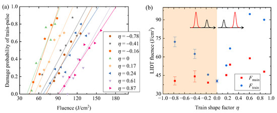 We carried out the damage threshold test with a dual-pulse train and a delay of 20 ns and investigated the impact of dual-pulse shapes on the laser damage threshold. The experimental results of damage probability with laser fluence of pulse trains for various shape factors η are shown in Figure 3a. Based on the fitting lines, we obtained the 0% probability damage threshold of the dual-pulse train Ftrain with various shapes, as shown in Figure 3b by the circles. Then, we calculated the main-pulse threshold Fmain based on the definition of η, also shown in Figure 3b by the squares. We change the shape factor η in the experiment such that the train shape first ramps down (η < 0) and then ramps up (η > 0), as shown in the insets of Figure 3b.