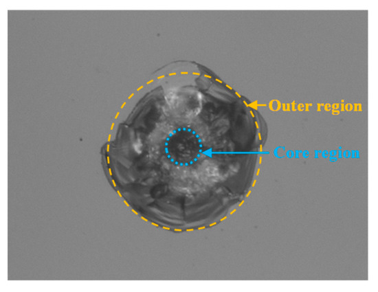 Optical microscopic image of a typical damage site on fused silica exit surface induced by a nanosecond pulse at 355 nm. The core region and the outer region of the damage site are indicated by blue and orange dashed circles, respectively.