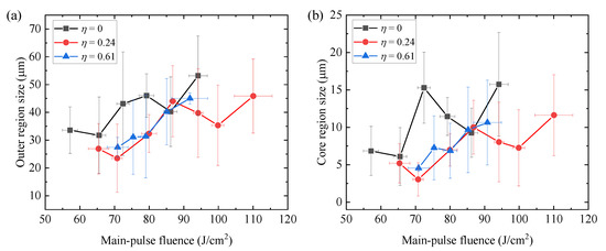 The statistical average size dependence of (a) the outer and (b) core regions of the damage sites on main-pulse fluence for η = 0 (single-pulse), η = 0.24 and η = 0.61 based the original data in the red dashed frames in Figure 6.