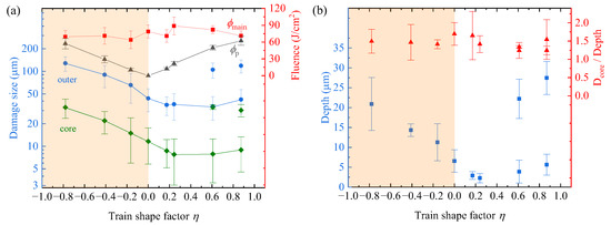 In order to demonstrate directly the modulation law of temporal shaping on the damage size, we statistically calculated the average sizes of the damage sites with error bars for every shape factor and plot the curves of the average damage size with dual-pulse shape factor in Figure 9a. In term of the statistical method, we combined all the scatter data for a shape factor, such as those shown in Figure 6, into one value of the average size with the error bars of the damage size and laser fluence and thus obtained nine average damage sizes for nine shapes shown in Figure 9a. The right side of the vertical axis in Figure 9a indicates the average fluence of the main-pulse and pre- or post-pulse corresponding to the damage sites to reveal their role in the damage modulation. We can clearly see that the functions of the damage sizes of the outer and core regions on the shape factor are significantly different between the two regimes of η > 0 and η < 0, i.e., the ramp-up and ramp-down shapes, respectively.