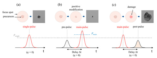 As shown in Figure 2, the two sub-pulses are named the main-pulse, with larger energy, and the pre-pulse (or post-pulse), with less energy. The pulse energy for the two sub-pulses is independently adjusted and their fluences are expressed as ϕmain and ϕp, respectively. Then, the dual-pulse train fluence can be denoted as ϕtrain = ϕp + ϕmain. The dual-pulse train shape is indicated by the shape factor η = ±ϕp/ϕmain, i.e., the fluence ratio of the pre-/post-pulse to the main pulse, while the sign indicates the pre- and post-pulse cases, respectively. For the pre-pulse case, η > 0, the dual-pulse has a ramp-up shape, as shown in Figure 2a; here, ϕp denotes the pre-pulse fluence. For the post-pulse, η < 0 and the dual–pulse has a ramp-down shape as shown in Figure 2b; here, ϕp denotes the post-pulse fluence. As a special case, η = 0 denotes the case of a single pulse.