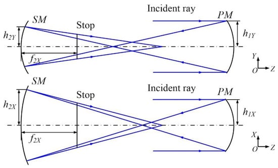 A schematic diagram of the anamorphic system is shown in Figure 2; it is based on a Gregorian structure, and we analyze it in the XOZ and YOZ planes simultaneously. In the initial structural analysis, it is assumed that the rays from infinity and the marginal ray heights on the primary mirror (PM) are equal in the XOZ and YOZ planes (h1X = h1Y, and h1X and h1Y are the marginal ray heights on the PM in the X and Y directions, respectively). The stop is located on the front focal plane of the secondary mirror (SM) in the XOZ plane, and the system is telecentric in the XOZ plane. The PM assumes a large anamorphic effect, such that the marginal ray heights on the SM change significantly in two directions (h2X > h2Y, and h2X and h2Y are the marginal ray heights on the SM in the X and Y directions, respectively). The parallel rays are first imaged by the PM at different positions in the XOZ and YOZ planes between the PM and the SM; there is obvious astigmatism. Thus, SM provides aberration compensation for the system such that the two intermediate images at different positions are re-imaged at the same position.