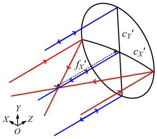 Calculating the initial structure is the first step in optical design, and a feasible initial structure can improve optical design efficiency. Compared with traditional optical systems, anamorphic telescopes have different focal lengths in the X and Y directions; thus, an anamorphic system has different parameters in two mutually perpendicular directions. A surface map of an anamorphic surface is shown in Figure 1, where cX and cY are the curvature of the anamorphic surface in the X and Y directions, respectively, and fX and fY are the focal lengths of the anamorphic surface in the X and Y directions, respectively.
