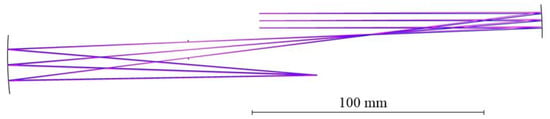 First, we determined the initial structural parameters in the X direction. The system constraints include the diameter of the entrance pupil and the relative aperture of the PM in the X direction. When the specifications of the system are determined, according to Equations (1) and (2), the radii of the curvatures R1X and R2X of the PM and SM, the aspheric coefficients −e1X2 and −e2X2 of the PM and SM, the distance dX between the two mirrors, and the distance lX′ between the SM and the image plane in the X direction can be calculated.