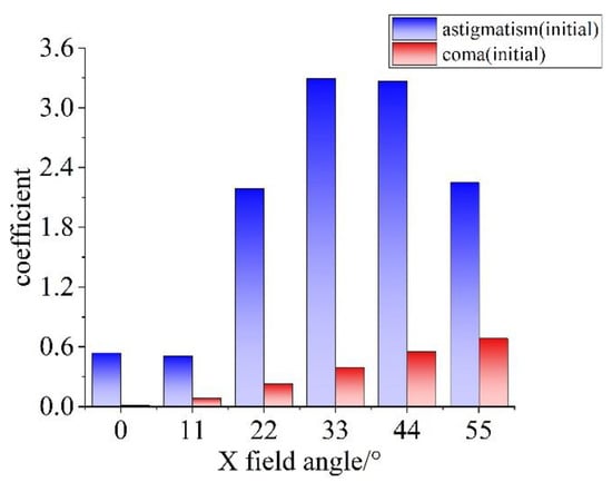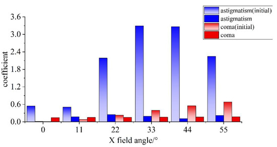 Further optimization was performed on the constructed anamorphic system using the optical design software. The FOV in the system was set, and the aberrations were analyzed. The variations in coma and astigmatism with the FOV are shown in Figure 6. When the FOV was wider than 15°, the astigmatism of the system was more serious than the coma. Therefore, astigmatism was the most significant aberration to correct. Through analyses, we set the astigmatism contribution terms of the XY polynomial as variables to eliminate this aberration until the requirement was reached. The analysis and optimization methods used for astigmatism are also applicable to other aberrations, so the correction of other aberrations was not performed here.