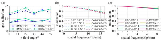 Performance analysis results of the UFOTAS: (a) spot diagram, (b) MTF in the X direction, (c) MTF in the Y direction.