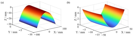 The A3x2 term is a parabolic surface equation, and a surface map of the A3x2 term is shown in Figure 3, where cX′ and cY′ are the curvature of the parabolic surface in the X and Y directions, respectively, and fX′ is the focal length of the parabolic surface in the X direction. The curvature of the surface in the YOZ plane is zero (cY′ = 0), and the radius of the curvature in the XOZ plane is expressed as follows: