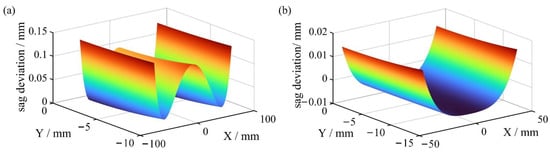 The freeform surface coefficients of the PM and SM are shown in Table 2. The overall volume of the UFOTAS was approximately 140 mm (X) × 35 mm (Y) × 270 mm (Z); the size of the PM was approximately 140 mm × 10 mm; and the size of the SM was approximately 80 mm × 15 mm. To evaluate the freeform surfaces, we plotted the surface maps of the PM and SM as shown in Figure 10, and we calculated the sag deviation of each surface from its best-fit sphere, as shown in Figure 11.