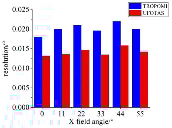 TROPOMI, as an ultrawide FOV anamorphic telescope successfully applied to atmospheric remote sensing, has a very important learning value and reference significance. Therefore, we referred to TROPOMI’s specifications and simulated the UFOTAS as an example. As shown in Table 3, our design achieved an ultrawide FOV anamorphic telescope with a lower-order XY polynomial. To obtain a small image spot size, we increased the F-number. The resolutions of the UFOTAS and TROPOMI are shown in Figure 12. It can be seen that the UFOTAS has a higher resolution and remains much more constant over the field. The maximum sag deviation between TROPOMI’s mirror and its best-fit spherical surface is approximately 0.3 mm, while the maximum sag deviation of the UFOTAS is approximately 0.15 mm. The surfaces in the UFOTAS have gentle shapes, which can greatly reduce the manufacturing difficulty and cost. As for the design results shown in Section 3, the simulated UFOTAS using the method mentioned in this study has good image quality and meets the requirements of an ultrawide FOV, with an anamorphic and compact structure. This demonstrates that the design method described in this study is feasible.