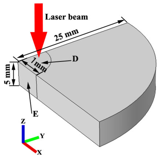 Schematic diagram of simulation model. The symbol “D” denotes the heat source volume, and the symbol “E” indicates the symmetric boundary.