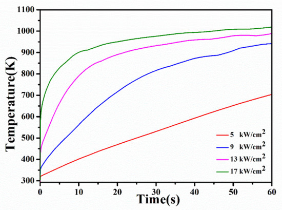 Figure 2 shows the central temperature change curves of laser beam under 5000, 9000, 13,000 and 17,000 W/cm2 irradiation. At the beginning of laser irradiation, the temperature rises sharply due to convection and radiation. The highest temperature after 60 s is lower than the melting point of silicon wafer (1683.15 K). Therefore, no melting is expected under these conditions.